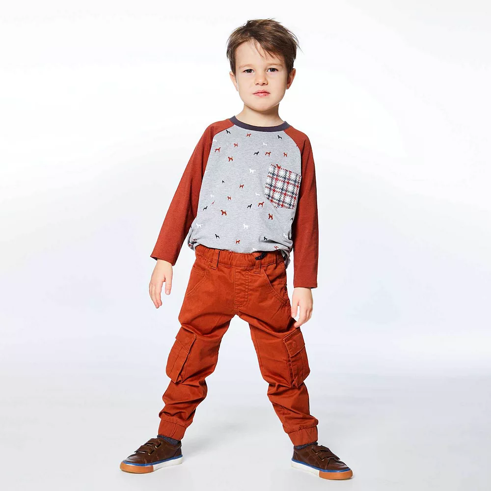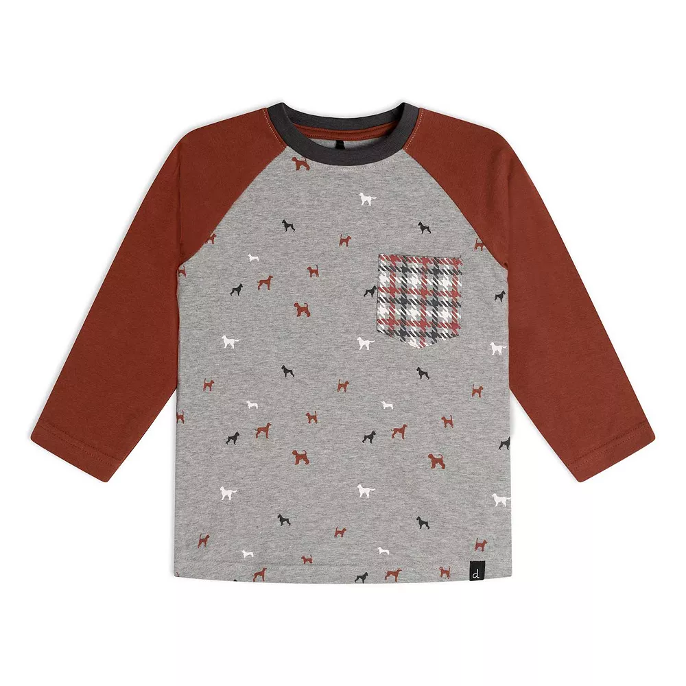 If he loves puppies, he’s sure to adore our Long Raglan Sleeve Top With Printed Dogs. This long sleeve tee is made from soft cotton/elastane and features contrast raglan sleeves, a ringer crew neckline, an allover print, and a contrast pocket on the left chest.