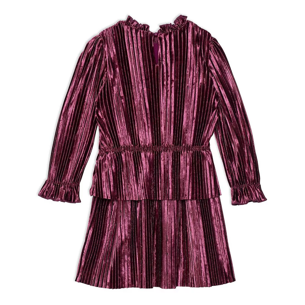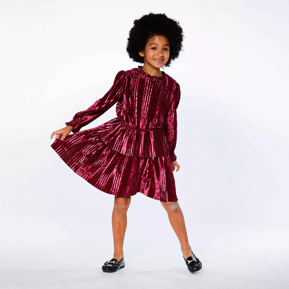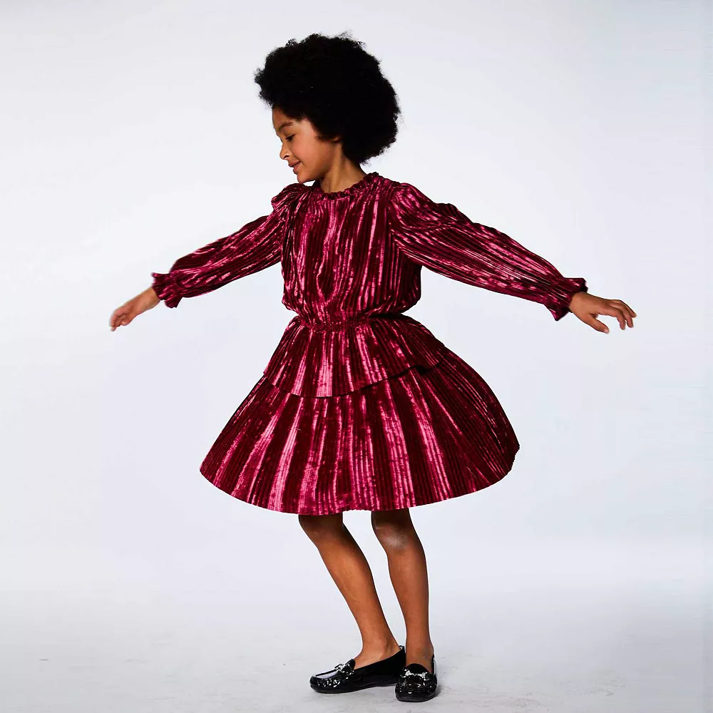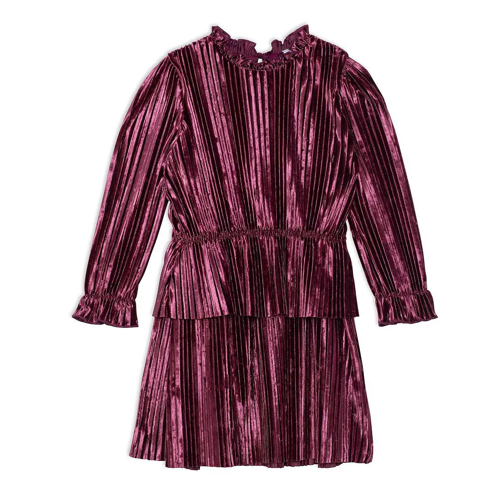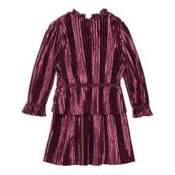 Our Long Sleeve Crinkle Dress Red Violet is a perfect choice for any party or special occasion. This design features long sleeves with elastic cuffs, a round neckline, and an elastic waist adorned with a fabric overlay.