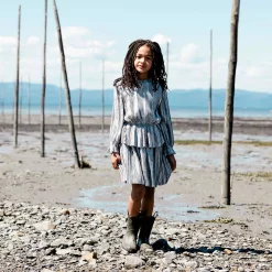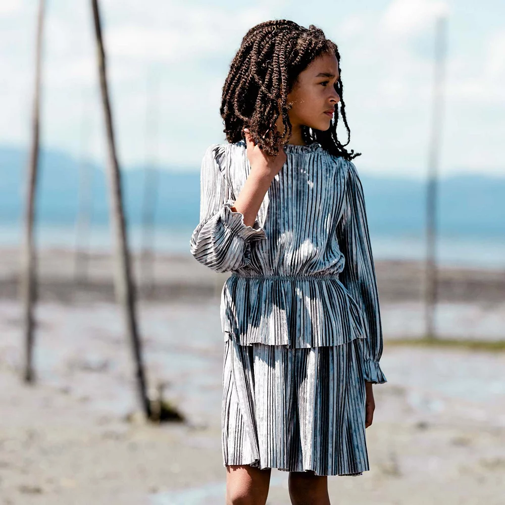 Our Long Sleeve Crinkle Dress Silver Grey is a perfect choice for any party or special occasion. This design features long sleeves with elastic cuffs, a round neckline, and an elastic waist adorned with a fabric overlay.