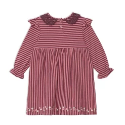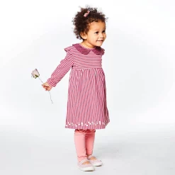 Horizontal and vertical stripes combine in our Long Sleeve Dress With Frill Striped. Made from soft cotton fabric, this dress features long sleeves with gathered cuffs, frills on each shoulder, a round neckline with a rounded lace collar, and a floral border print at the hem.