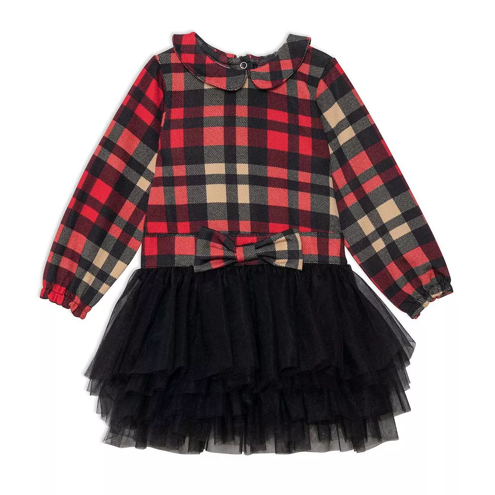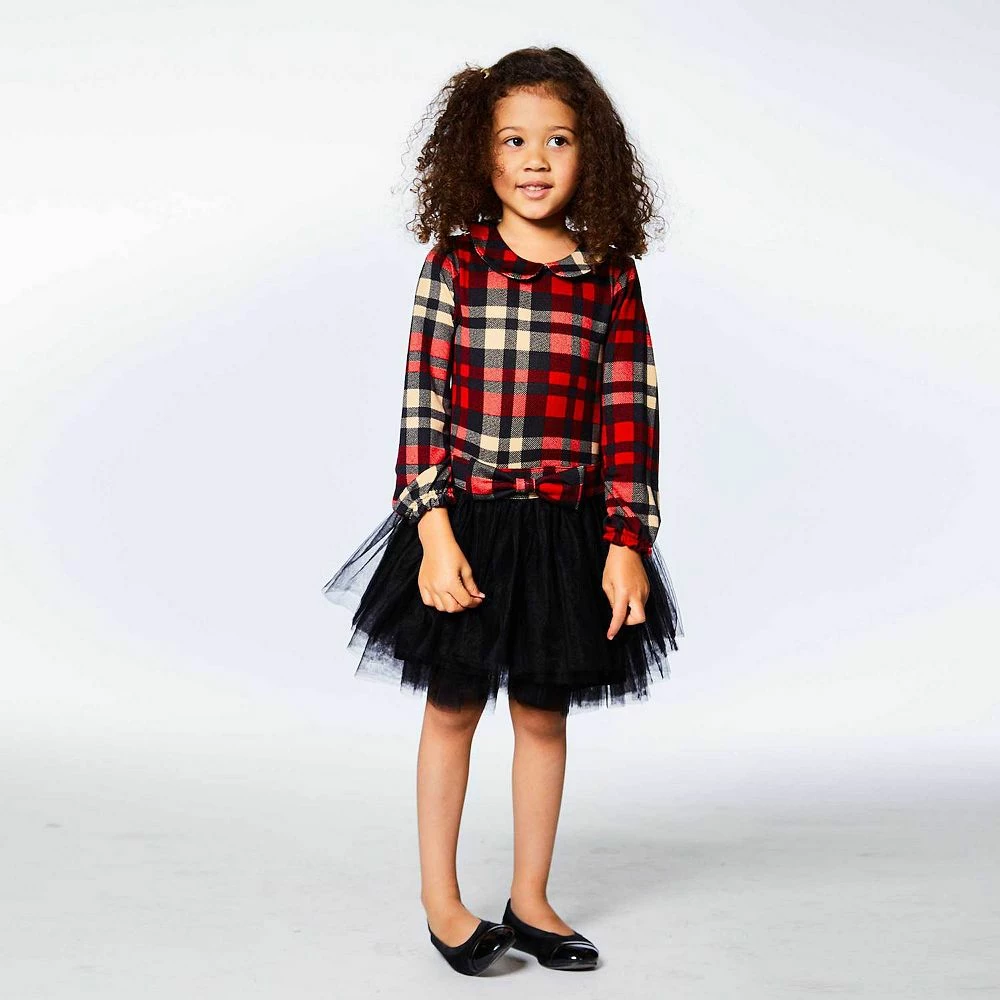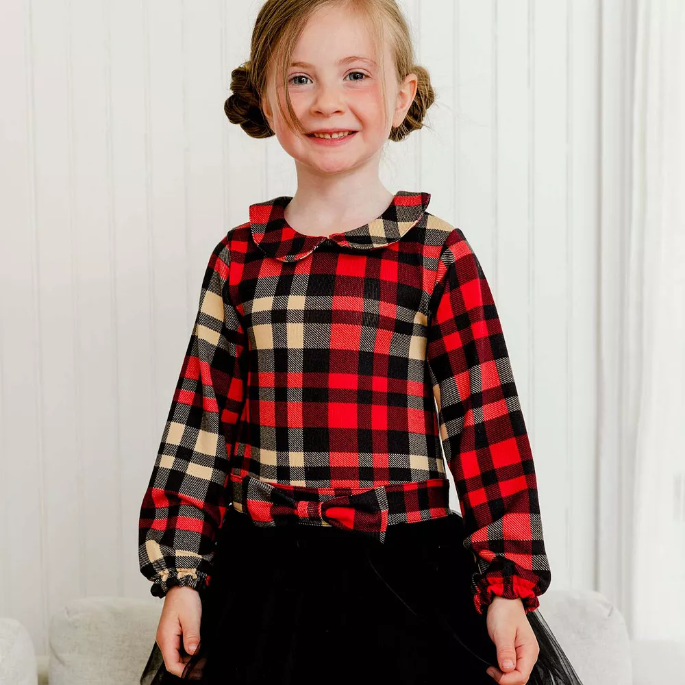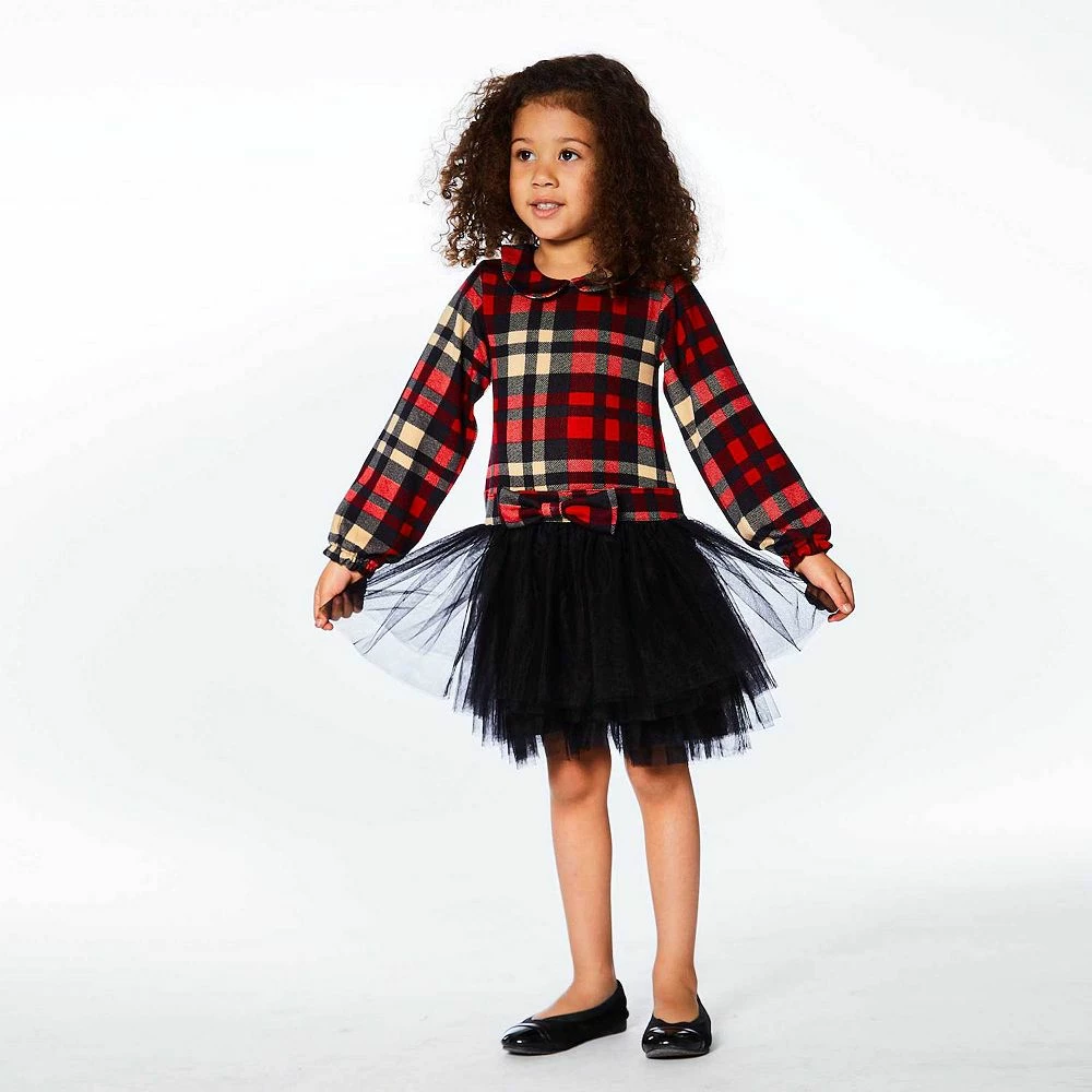 A round collar adds demure style to our Plaid Dress With Long Sleeves and Mesh Skirt. This two-tone design features a plaid bodice with long sleeves and elastic cuffs, a round neckline with a collar, back snaps, and a bow at the waist. A tiered mesh skirt adds playful style and tons of texture!