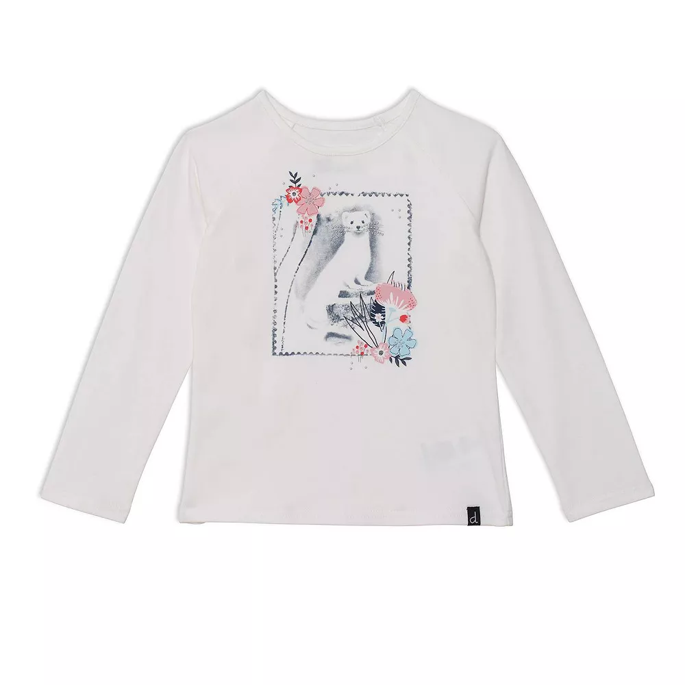 Make casual days a whole lot cuter with our Raglan Long Sleeve Top Off White. Soft and stretchy in a cotton/elastane blend, this top features long sleeves, a round neckline, and a floral and weasel print on the chest. Pair it with solid or printed leggings for the perfect head to toe look!